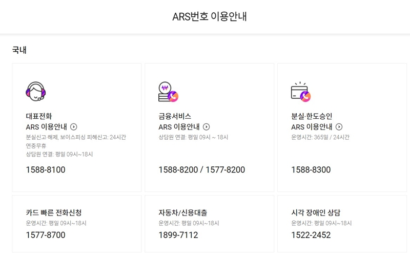 현금서비스·대출 1588-8200 / 1577-8200 ARS 24hr(상담원 평일 09:00~18:00) 업무별 안내에 따름